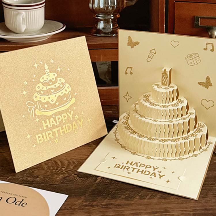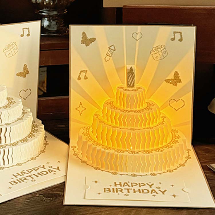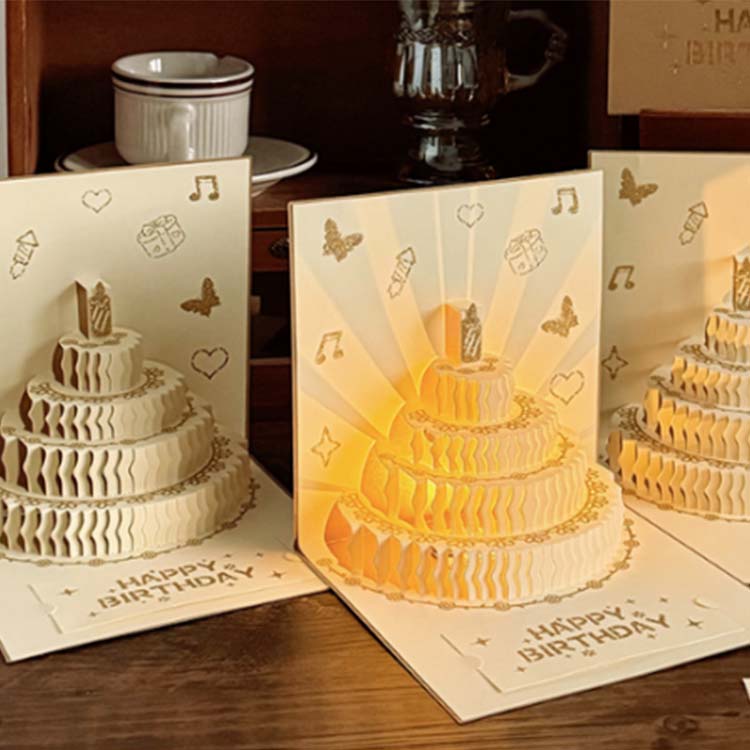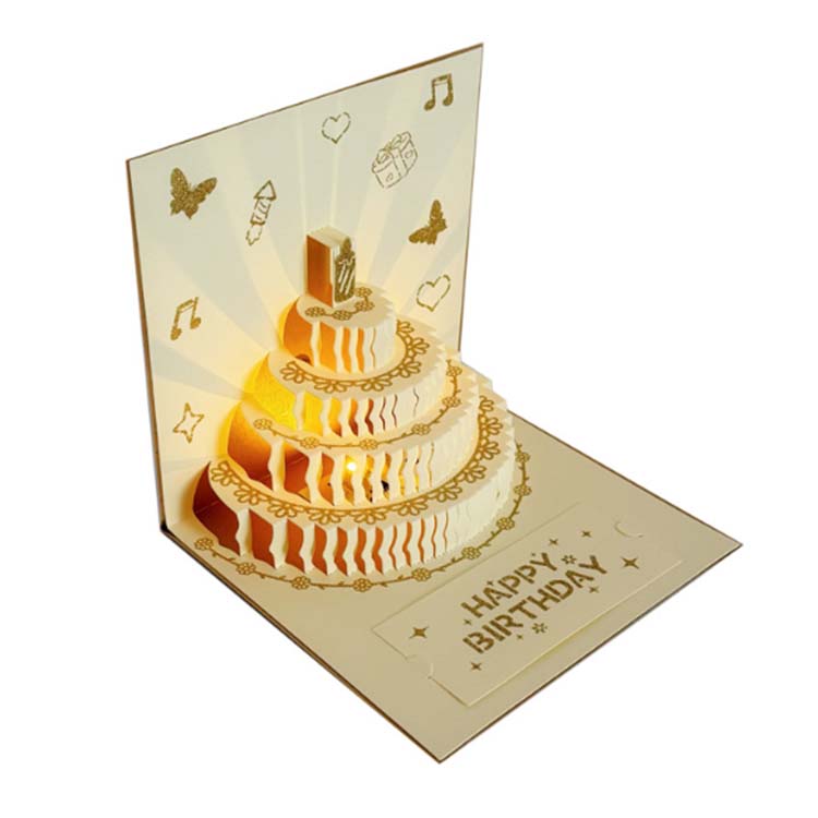 3D ad günü kartı təbrik kartı kateqoriyasında yeni bir məhsuldur. Ekoloji cəhətdən təmiz və təhlükəsiz materiallardan hazırlanmış, üç ölçülü bir forma və daxili işıqlandırma və musiqi effektləri var. Yığcam və portativ, zərf, bir kart və kiçik bir kartdan ibarətdir. Klassik və müasir elementləri qarışdıran hərtərəfli bir ad günü kartıdır.