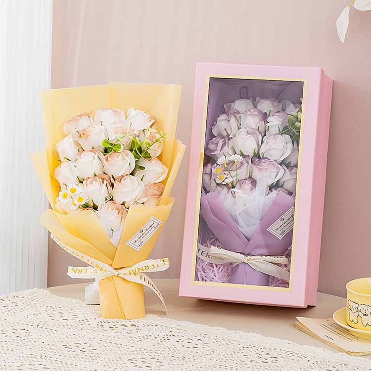 Buket hədiyyə qutusu isti ştamplama, şəffaf sərhədləri və çiçəkləri daha çox qat və yüksək səviyyəli hala gətirə bilən kabartma materialları var. İstifadə olunan materiallar, təzyiq əleyhinə və anti-deformasiya olan karton, laminasiya və ekoloji cəhətdən təmiz materiallardır. Hər hansı bir festival dövründə müştərilər ehtiyaclarına uyğun olaraq satın ala bilər, bu da səmərəli olan təsir göstərir.