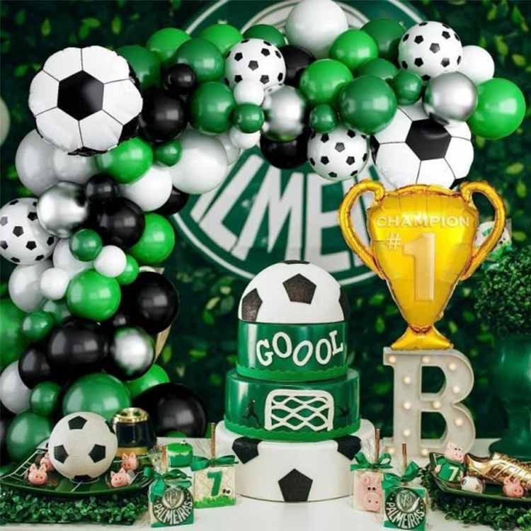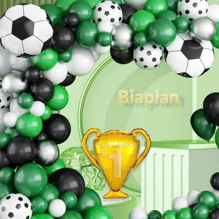 Futbol temalı balon arch dəstləri, əsas komponentlər kimi yaşıl, qara və ağ balonlar, futbol şəkilli balonları ilə bəzədilmiş bir dekorativ fon yaratmaq üçün bəzək kimi əlavə edilmiş futbol şəkilli balonlar kimi. Bu məhsul futbol hadisələri, futbol temalı partiyalar, futbol klubu fəaliyyətləri və s. Üçün xüsusi olaraq hazırlanmışdır, canlı atmosfer yaradır və futbol fəaliyyətlərini sevir.
