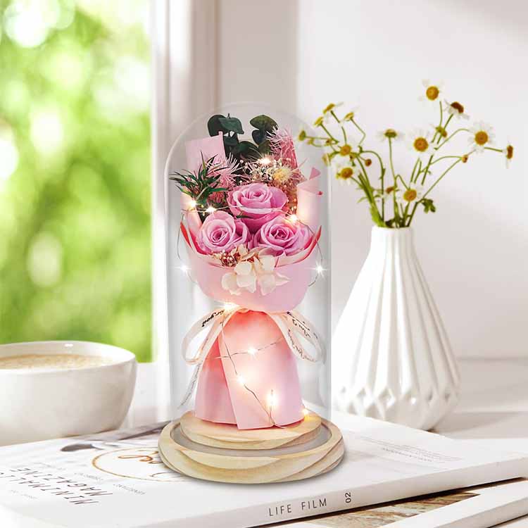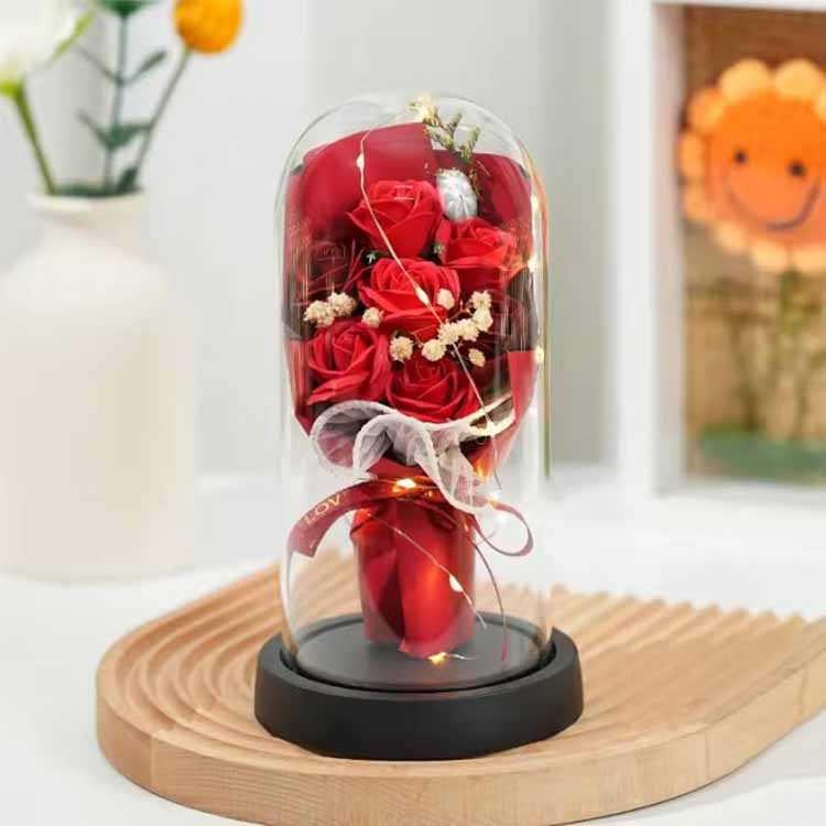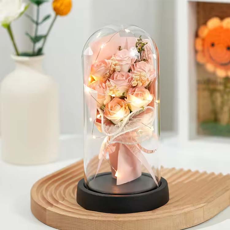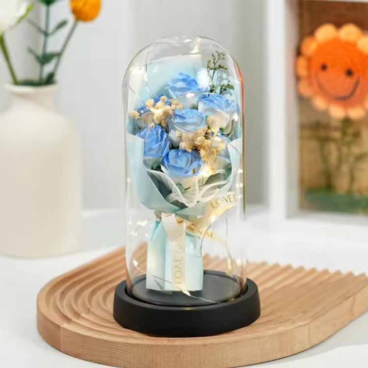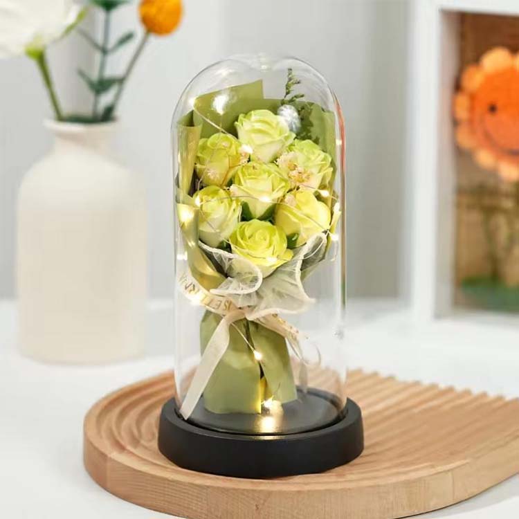 LED ilə şüşəli günbəz sabunlu buketi, sabun çiçəkləri ilə birləşmələrdən istifadə olunur. Bir hədiyyə olaraq verilmişdir Sabun çiçəkləri əlləri yumaq və ya ətir kimi yuymaq üçün də istifadə edilə bilər. Bu gül buketi iqtisadi və praktikdir.