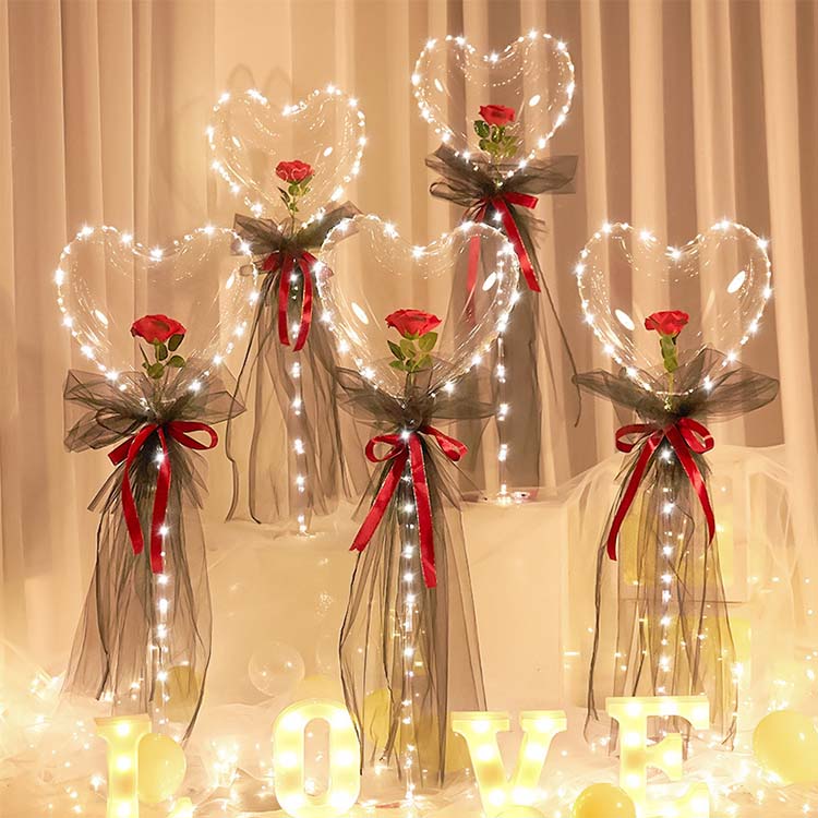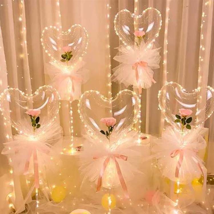 Dekorativ aksesuarlar: ümumiyyətlə,Ürək formalı bobo gül dəstləriKrujeva iplik, yüngül zolaqlar, hava nasosları, batareyaları və s. kimi bəzi bəzəklər müşayiət olunur. Krujeva bobo topuna bükülə bilər və bütövlükdə axan və romantik bir atmosfer əlavə etmək; Şerit gecə və ya qaranlıq şəraitdə yumşaq işıq yayır, bütün materialı daha çox xəyalpərəst və cazibədar hala gətirə bilər.