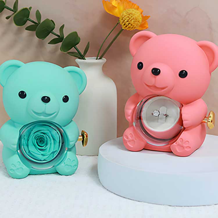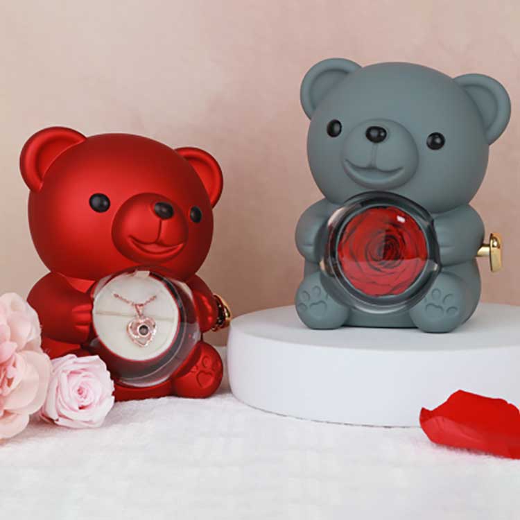 Bu Hug Bear Rose zərgərlik qutusu masada, kitab rəfində və ya yataq masasında nümayiş etdirmək üçün istifadə olunur. Onun ən diqqət çəkən xüsusiyyəti mərkəzdə saxlanılan qızılgüldür. Qızılgülün açılması zərgərlik, üzük və ya yadigarların saxlanması üçün bölməni göstərir.
