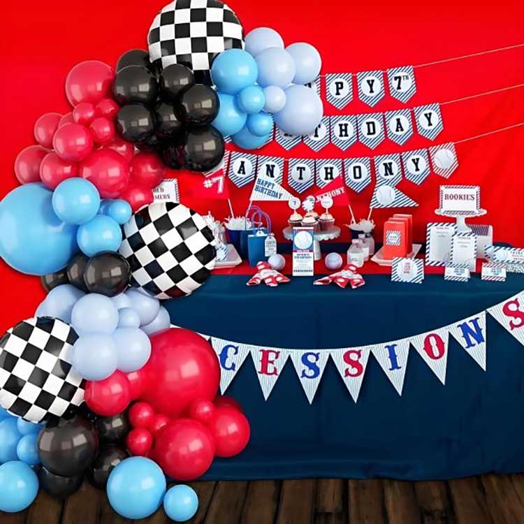 Yarış mövzusu Balloon Arch Dekorasiya dəsti, yarış temalı tərəflər, hadisələr və ad günü partiyaları üçün xüsusi olaraq hazırlanmış bir dekorativ həlldir. Bu məhsul avtomobil yarışları mövzusunda mərkəzləşmişdir. Qara, gümüş, mavi və qırmızı lateks şarlar, eləcə də avtomobillərin və yarış aksesuarlarının modelləri, bəzək şəklini meydana gətirməyin, hadisənin məkanı üçün ehtiraslı və şən bir atmosfer yaratmağın son nəticəsinə nail olur.